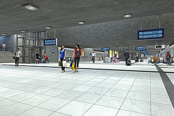 Künftig wird sich Mobilität am Hauptbahnhof auf drei Ebenen abspielen: Oben an den Bahnsteigen der Deutschen Bahn, unten im Bereich der neuen swa Straßenbahnhaltestelle sowie in der Verteilerebene dazwischen, welche die beiden Schienensysteme barrierefrei über Aufzüge und Fahrtreppen miteinander verbindet. So ist die Mobilität der Zukunft allen zugänglich, egal ob jung oder alt, mit Kinderwagen, Gehhilfe, Rollstuhl oder sehbehindert.